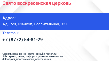 Свято-воскресенская церковь по адресу Адыгея, Майкоп, Госпитальная, 327 в дальнейшем Организация, размещена в следующих категориях:
