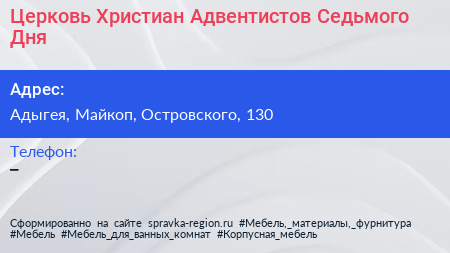 Церковь Христиан Адвентистов Седьмого Дня по адресу Адыгея, Майкоп, Островского, 130 в дальнейшем Организация, размещена в следующих категориях: