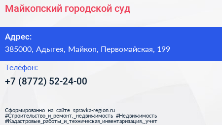 Майкопский городской суд по адресу 385000, Адыгея, Майкоп, Первомайская, 199 в дальнейшем Организация, размещена в следующих категориях: