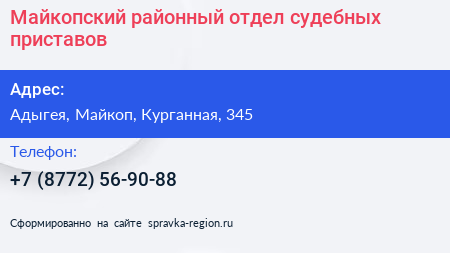 Майкопский районный отдел судебных приставов по адресу Адыгея, Майкоп, Курганная, 345 в дальнейшем Организация, размещена в следующих категориях: