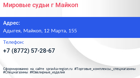 Мировые судьи г. Майкоп по адресу Адыгея, Майкоп, 12 Марта, 155 в дальнейшем Организация, размещена в следующих категориях: