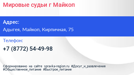 Мировые судьи, г. Майкоп по адресу Адыгея, Майкоп, Кирпичная, 75 в дальнейшем Организация, размещена в следующих категориях: