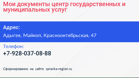 Мои документы, центр государственных и муниципальных услуг по адресу Адыгея, Майкоп, Краснооктябрьская, 47 в дальнейшем Организация, размещена в следующих категориях: