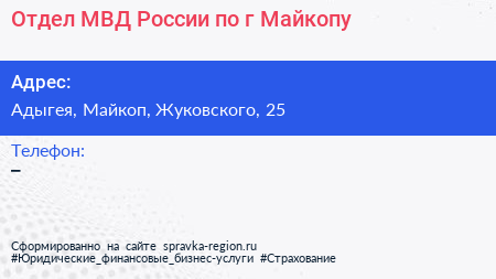 Отдел МВД России по г. Майкопу по адресу Адыгея, Майкоп, Жуковского, 25 в дальнейшем Организация, размещена в следующих категориях: