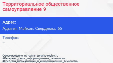 Территориальное общественное самоуправление №9 по адресу Адыгея, Майкоп, Свердлова, 65 в дальнейшем Организация, размещена в следующих категориях: