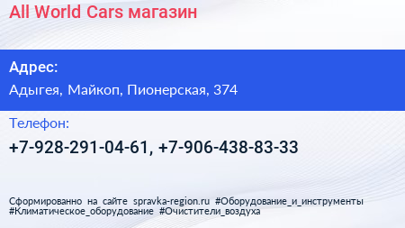 All World Cars, магазин по адресу Адыгея, Майкоп, Пионерская, 374 в дальнейшем Организация, размещена в следующих категориях: