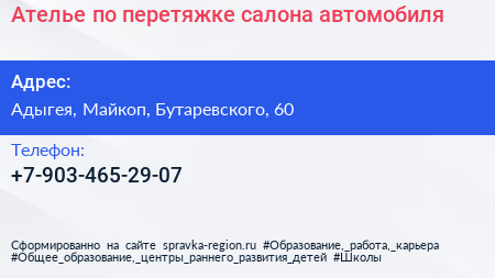 Ателье по перетяжке салона автомобиля по адресу Адыгея, Майкоп, Бутаревского, 60 в дальнейшем Организация, размещена в следующих категориях: