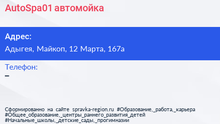 AutoSpa01, автомойка по адресу Адыгея, Майкоп, 12 Марта, 167а в дальнейшем Организация, размещена в следующих категориях: