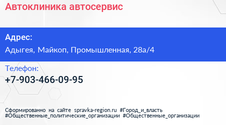 Автоклиника, автосервис по адресу Адыгея, Майкоп, Промышленная, 28а/4 в дальнейшем Организация, размещена в следующих категориях:
