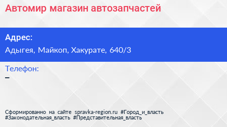 Автомир, магазин автозапчастей по адресу Адыгея, Майкоп, Хакурате, 640/3 в дальнейшем Организация, размещена в следующих категориях: