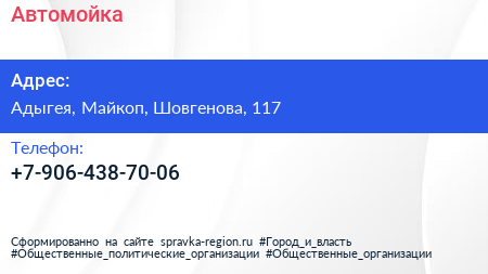 Автомойка по адресу Адыгея, Майкоп, Шовгенова, 117 в дальнейшем Организация, размещена в следующих категориях: