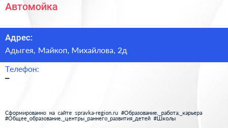 Автомойка по адресу Адыгея, Майкоп, Михайлова, 2д в дальнейшем Организация, размещена в следующих категориях: