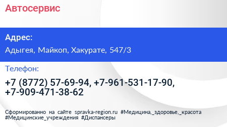 Автосервис по адресу Адыгея, Майкоп, Хакурате, 547/3 в дальнейшем Организация, размещена в следующих категориях: