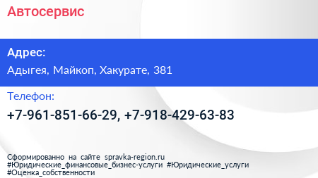 Автосервис по адресу Адыгея, Майкоп, Хакурате, 381 в дальнейшем Организация, размещена в следующих категориях: