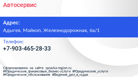 Автосервис по адресу Адыгея, Майкоп, Железнодорожная, 6а/1 в дальнейшем Организация, размещена в следующих категориях: