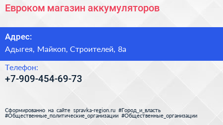 Евроком, магазин аккумуляторов по адресу Адыгея, Майкоп, Строителей, 8а в дальнейшем Организация, размещена в следующих категориях: