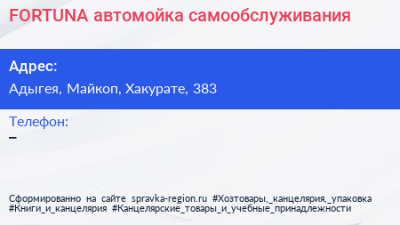 FORTUNA, автомойка самообслуживания по адресу Адыгея, Майкоп, Хакурате, 383 в дальнейшем Организация, размещена в следующих категориях: