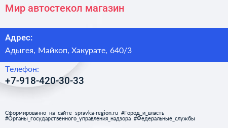 Мир автостекол, магазин по адресу Адыгея, Майкоп, Хакурате, 640/3 в дальнейшем Организация, размещена в следующих категориях: