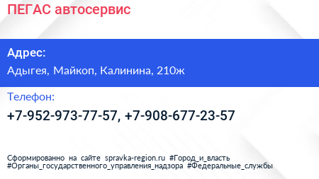 ПЕГАС, автосервис по адресу Адыгея, Майкоп, Калинина, 210ж в дальнейшем Организация, размещена в следующих категориях: