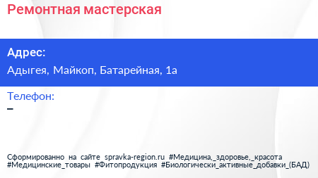 Ремонтная мастерская по адресу Адыгея, Майкоп, Батарейная, 1а в дальнейшем Организация, размещена в следующих категориях: