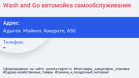 Wash and Go, автомойка самообслуживания по адресу Адыгея, Майкоп, Хакурате, 650 в дальнейшем Организация, размещена в следующих категориях: