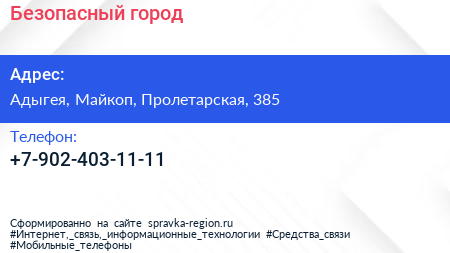 Безопасный город по адресу Адыгея, Майкоп, Пролетарская, 385 в дальнейшем Организация, размещена в следующих категориях: