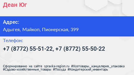 Деан Юг по адресу Адыгея, Майкоп, Пионерская, 399 в дальнейшем Организация, размещена в следующих категориях: