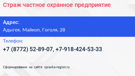 Страж, частное охранное предприятие по адресу Адыгея, Майкоп, Гоголя, 28 в дальнейшем Организация, размещена в следующих категориях: