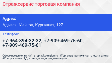 Стражсервис, торговая компания по адресу Адыгея, Майкоп, Курганная, 197 в дальнейшем Организация, размещена в следующих категориях: