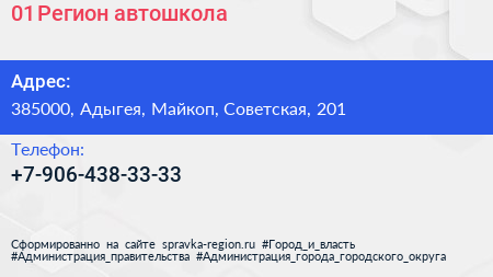 01 Регион, автошкола по адресу 385000, Адыгея, Майкоп, Советская, 201 в дальнейшем Организация, размещена в следующих категориях: