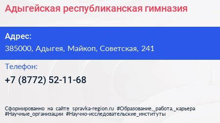 Адыгейская республиканская гимназия по адресу 385000, Адыгея, Майкоп, Советская, 241 в дальнейшем Организация, размещена в следующих категориях: