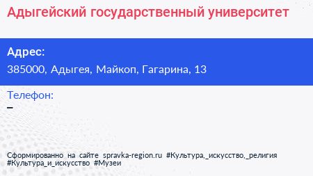 Адыгейский государственный университет по адресу 385000, Адыгея, Майкоп, Гагарина, 13 в дальнейшем Организация, размещена в следующих категориях: