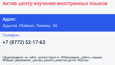 Актив, центр изучения иностранных языков по адресу Адыгея, Майкоп, Ленина, 36 в дальнейшем Организация, размещена в следующих категориях: