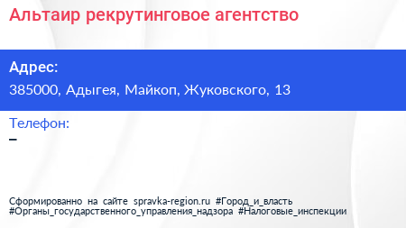 Альтаир, рекрутинговое агентство по адресу 385000, Адыгея, Майкоп, Жуковского, 13 в дальнейшем Организация, размещена в следующих категориях: