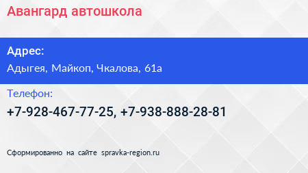 Авангард, автошкола по адресу Адыгея, Майкоп, Чкалова, 61а в дальнейшем Организация, размещена в следующих категориях: