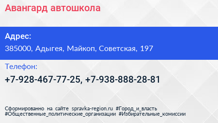 Авангард, автошкола по адресу 385000, Адыгея, Майкоп, Советская, 197 в дальнейшем Организация, размещена в следующих категориях: