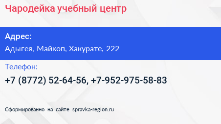 Чародейка, учебный центр по адресу Адыгея, Майкоп, Хакурате, 222 в дальнейшем Организация, размещена в следующих категориях: