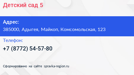 Детский сад №5 по адресу 385000, Адыгея, Майкоп, Комсомольская, 123 в дальнейшем Организация, размещена в следующих категориях: