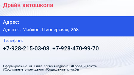 Драйв, автошкола по адресу Адыгея, Майкоп, Пионерская, 268 в дальнейшем Организация, размещена в следующих категориях: