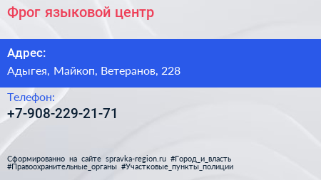 Фрог, языковой центр по адресу Адыгея, Майкоп, Ветеранов, 228 в дальнейшем Организация, размещена в следующих категориях: