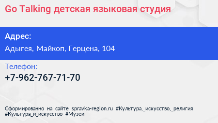 Go! Talking, детская языковая студия по адресу Адыгея, Майкоп, Герцена, 104 в дальнейшем Организация, размещена в следующих категориях: