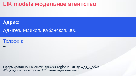 LIK models, модельное агентство по адресу Адыгея, Майкоп, Кубанская, 300 в дальнейшем Организация, размещена в следующих категориях: