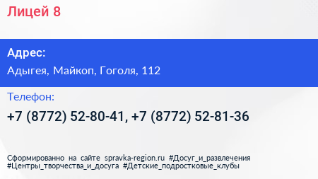 Лицей №8 по адресу Адыгея, Майкоп, Гоголя, 112 в дальнейшем Организация, размещена в следующих категориях: