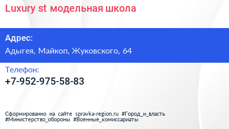 Luxury.st, модельная школа по адресу Адыгея, Майкоп, Жуковского, 64 в дальнейшем Организация, размещена в следующих категориях: