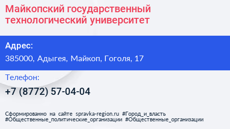 Майкопский государственный технологический университет по адресу 385000, Адыгея, Майкоп, Гоголя, 17 в дальнейшем Организация, размещена в следующих категориях: