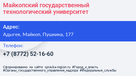 Майкопский государственный технологический университет по адресу Адыгея, Майкоп, Пушкина, 177 в дальнейшем Организация, размещена в следующих категориях: