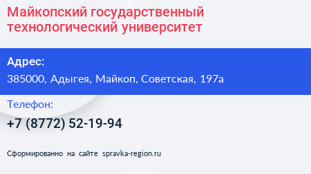 Майкопский государственный технологический университет по адресу 385000, Адыгея, Майкоп, Советская, 197а в дальнейшем Организация, размещена в следующих категориях: