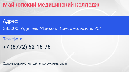 Майкопский медицинский колледж по адресу 385000, Адыгея, Майкоп, Комсомольская, 201 в дальнейшем Организация, размещена в следующих категориях: