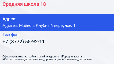 Средняя школа №18 по адресу Адыгея, Майкоп, Клубный переулок, 1 в дальнейшем Организация, размещена в следующих категориях: