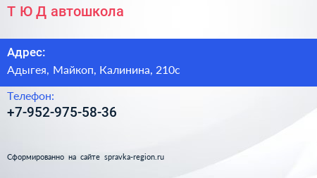 Т.Ю.Д., автошкола по адресу Адыгея, Майкоп, Калинина, 210с в дальнейшем Организация, размещена в следующих категориях: